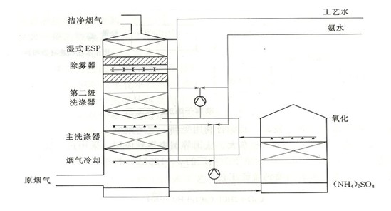 脫硫工藝以氨水作為吸收劑,副產品為硫酸銨化肥。鍋爐來的煙氣經煙氣換熱器冷卻至90~100℃,進入預洗滌器經洗滌后除去HCl和HF,洗滌后的煙氣經過液滴分離器除去水滴進入前置洗滌器中。在前置洗滌器中,氨水自塔頂噴淋洗滌煙氣,煙氣中的SO2被洗滌吸收除去,洗滌后的煙氣排除后,經液滴分離器除去攜帶的水滴,進入脫硫洗滌器。在該洗滌器中煙氣進一步被洗滌,經洗滌塔頂部的除霧器出去霧滴,再經過煙氣換熱器加熱后經煙囪排放。